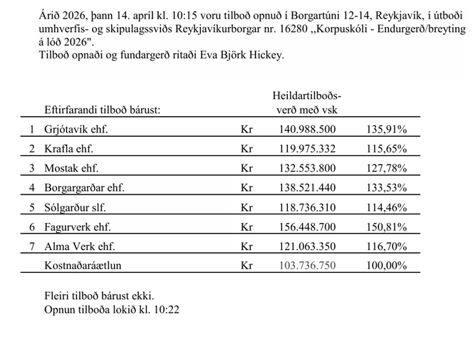 Home Fréttir Í fréttum Opnun útboðs: Korpuskóli – Endurgerð-breyting á lóð 2026 FréttirÍ fréttumNiðurstöður útboða Opnun útboðs: Korpuskóli – Endurgerð-breyting á lóð 2026 By byggingar - 14/04/2026 228 0 FacebookTwitterPinterestWhatsAppLinkedinEmailPrint Heimild: Reykjavík.is