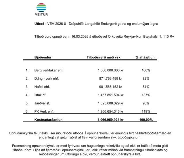 Home Fréttir Í fréttum Opnun útboðs: Veitur ohf. Drápuhlíð-Langahlíð Endurgerð gatna og endurnýjun lagna FréttirÍ fréttumNiðurstöður útboða Opnun útboðs: Veitur ohf. Drápuhlíð-Langahlíð Endurgerð gatna og endurnýjun lagna By byggingar - 16/04/2026 295 0 FacebookTwitterPinterestWhatsAppLinkedinEmailPrint Heimild: Veitur ohf.
