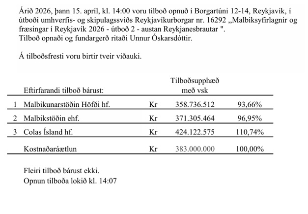 Home Fréttir Í fréttum Opnun útboðs: Malbiksyfirlagnir í Reykjavík 2026 – útboð 2 – austan Reykjanesbrautar FréttirÍ fréttumNiðurstöður útboða Opnun útboðs: Malbiksyfirlagnir í Reykjavík 2026 – útboð 2 – austan Reykjanesbrautar By byggingar - 18/04/2026 19 0 FacebookTwitterPinterestWhatsAppLinkedinEmailPrint Heimild: Reykjavikurborg