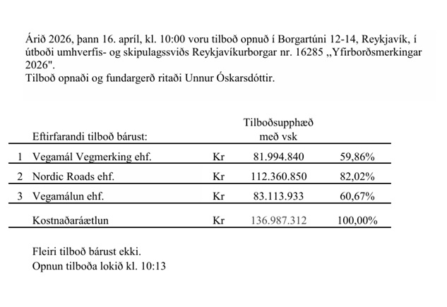 Home Fréttir Í fréttum Opnun útboðs: Yfirborðsmerkingar 2026 FréttirÍ fréttumNiðurstöður útboða Opnun útboðs: Yfirborðsmerkingar 2026 By byggingar - 18/04/2026 17 0 FacebookTwitterPinterestWhatsAppLinkedinEmailPrint Heimild: Reykjavikurborg