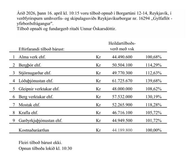 Home Fréttir Í fréttum Opnun útboðs: Gylfaflöt – Yfirborðsfrágangur FréttirÍ fréttumNiðurstöður útboða Opnun útboðs: Gylfaflöt – Yfirborðsfrágangur By byggingar - 18/04/2026 29 0 FacebookTwitterPinterestWhatsAppLinkedinEmailPrint Heimild: Reykjavikurborg