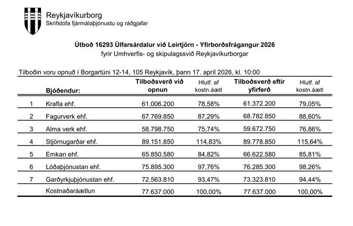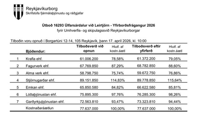 Home Fréttir Í fréttum Opnun útboðs: Úlfarsárdalur við Leirtjörn – Yfirborðsfrágangur 2026 FréttirÍ fréttum Opnun útboðs: Úlfarsárdalur við Leirtjörn – Yfirborðsfrágangur 2026 By byggingar - 19/04/2026 21 0 FacebookTwitterPinterestWhatsAppLinkedinEmailPrint Heimild: Reykjavikurborg